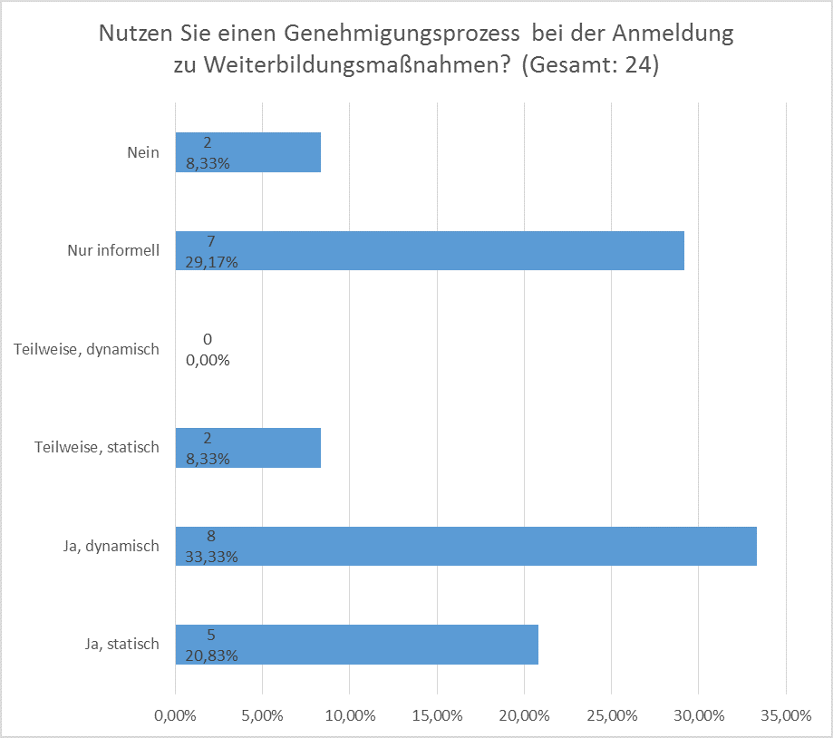 Wie zu sehen ist, verwenden nahezu alle Unternehmen (über 90%) in der ein oder anderen Weise einen Genehmigungsprozess, selbst wenn dieser, wie oben zu sehen ist, nur informell stattfindet. Informell beschreibt in diesem Fall, dass eine mündliche oder schriftliche Absprache mit dem jeweiligen Genehmiger erfolgt. Ein durch ein System unterstützter Workflow findet dabei keine Anwendung. Ziel des Genehmigungsprozesses ist es immer, die sinnvolle Verwendung des Bildungsbudgets zu kontrollieren und den Betriebs aufrechtzuerhalten. Die Analyse hat gezeigt, dass Letzteres insbesondere bei produzierenden Unternehmen wichtig ist – Es wäre problematisch, wenn alle Mitarbeiter, die eine bestimmte Qualifikation besitzen, gleichzeitig auf einer Weiterbildung sind.
